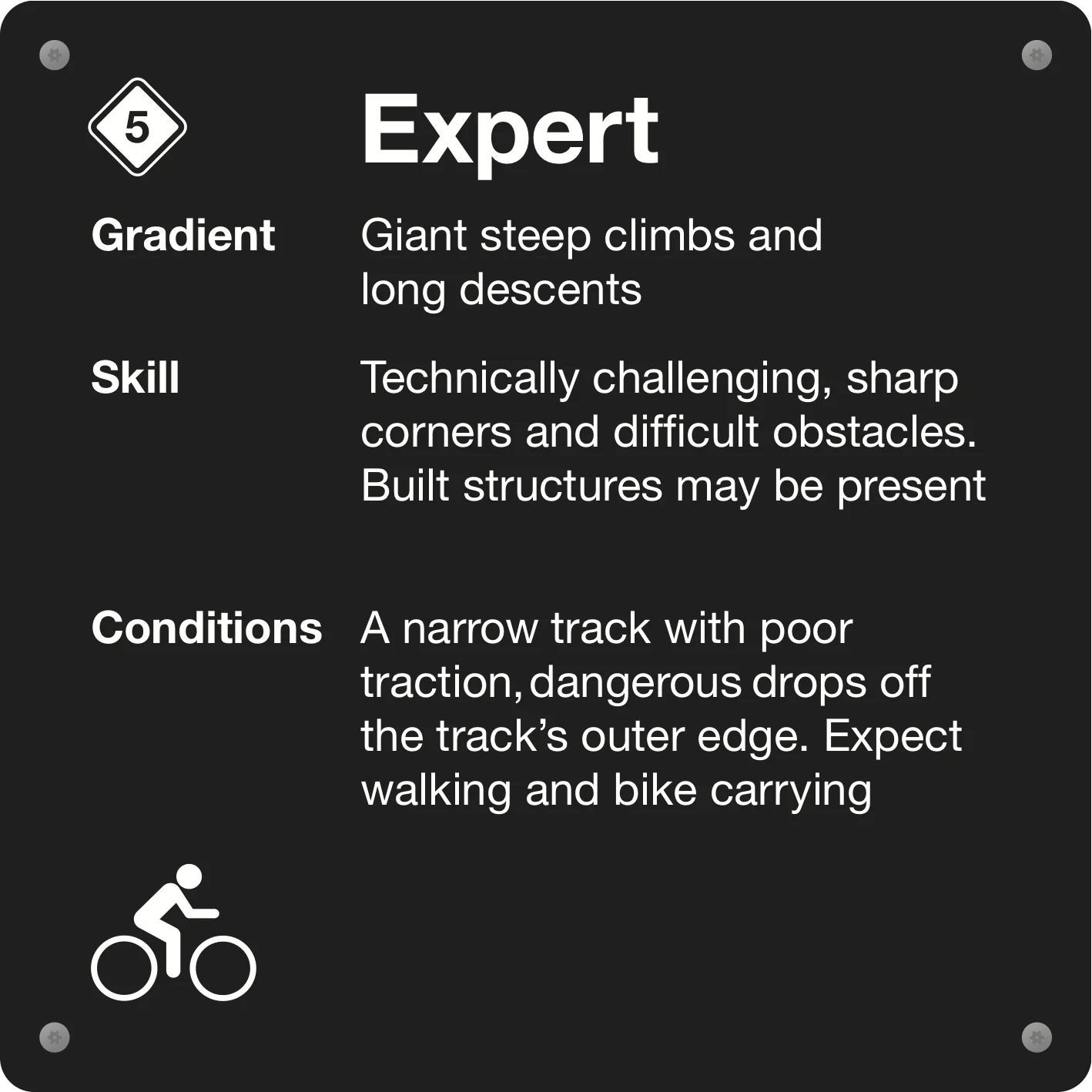 At Mākara Peak trails range from Easy through to Extreme. Always ride within your ability and check signage at the start of each trail.