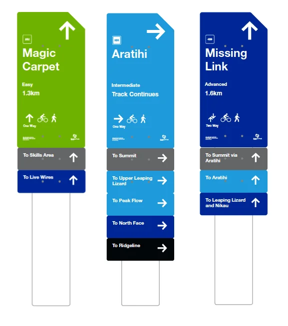 Below the main trail sign are the sub signs. Grey signs indicate major landmarks (summit, skills area etc) as well as an indication of which trails are coming up next.